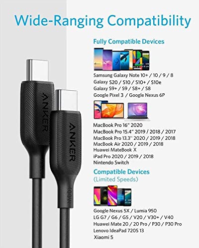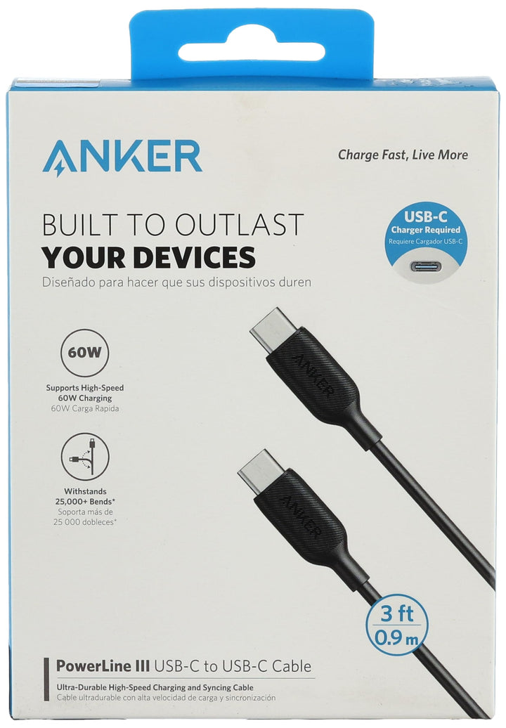 كابل باو لاين 3 بمنفذ USB النوع سي الي USB النوع سي 2.0 من انكر، طول 3 قدم - ابيض، لمحول الشحن